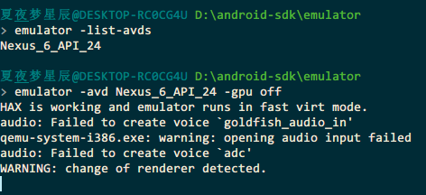 比较推荐命令行运行的方式 可以直观看到错误信息 开始的时候缺少HAXM, 以及不能开启Hyper-V 都是从命令行提示信息看到的